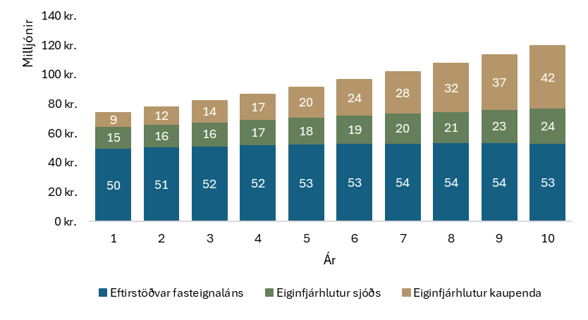 Í þessu dæmi er hækkun fasteignaverðs umfram verðbólgu sem leiðir af sér hækkun á eigið fé kaupenda og sjóðs.