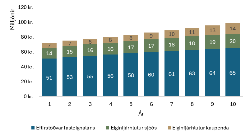 Upplýsingaskjalið veitir staðlaðar upplýsingar um hvernig fjárhæð leigu og eignarhlutur viðskiptavinar í húsnæðinu getur þróast yfir 10 ár tímabil miðað við tilteknar forsendur.